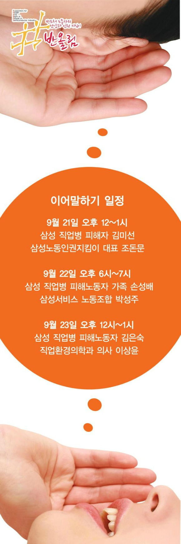 21(월) 12시 _ 피해자 김미선 님과 삼성노동인권지킴이 대표 조돈문 22(화) 18시 _ 피해자 고 손경주님 가족과 삼성서비스노동자 박성주 23(수) 12시 _ 피해자 김은숙님과 직업환경의학전문의 이상윤