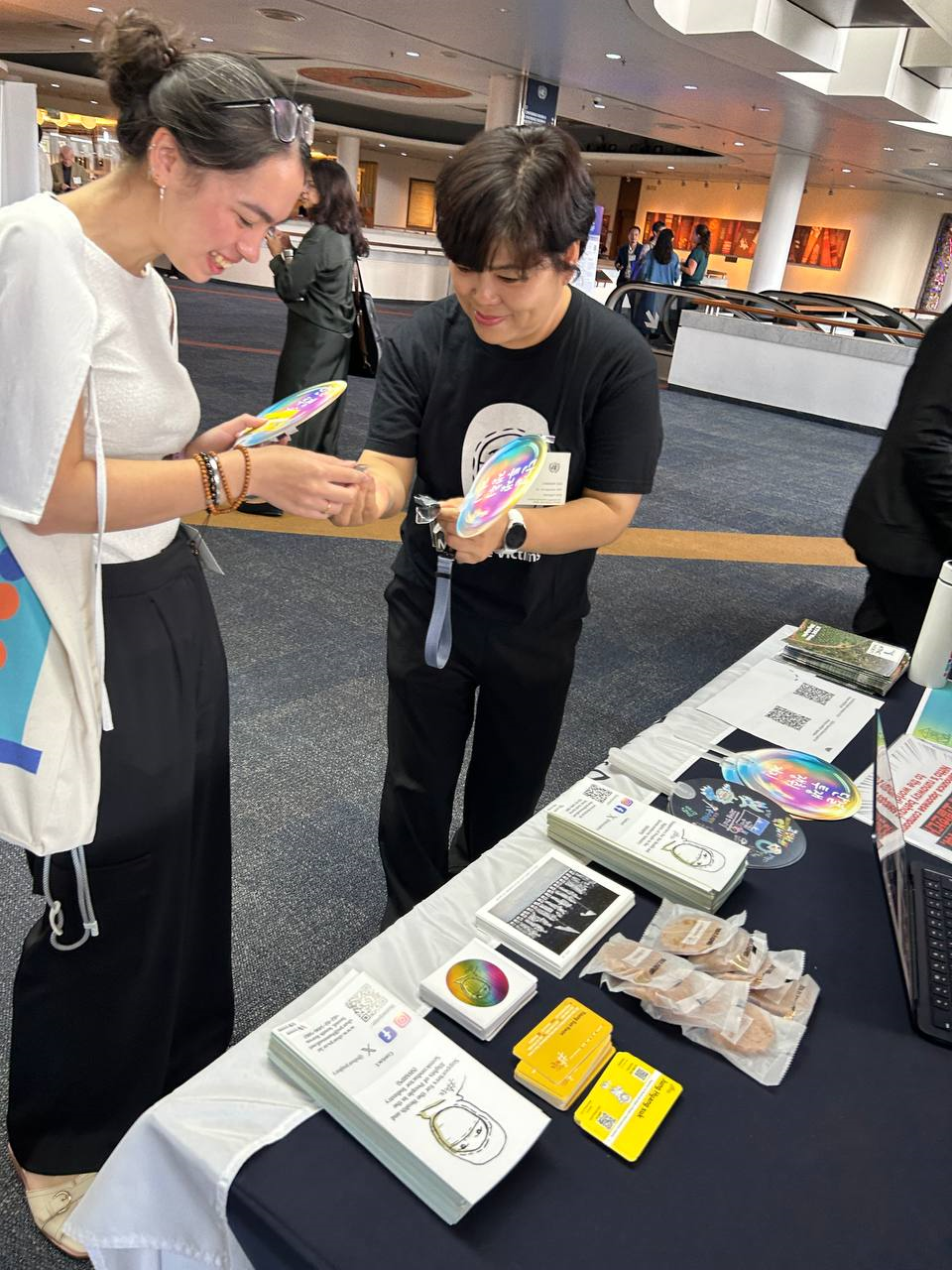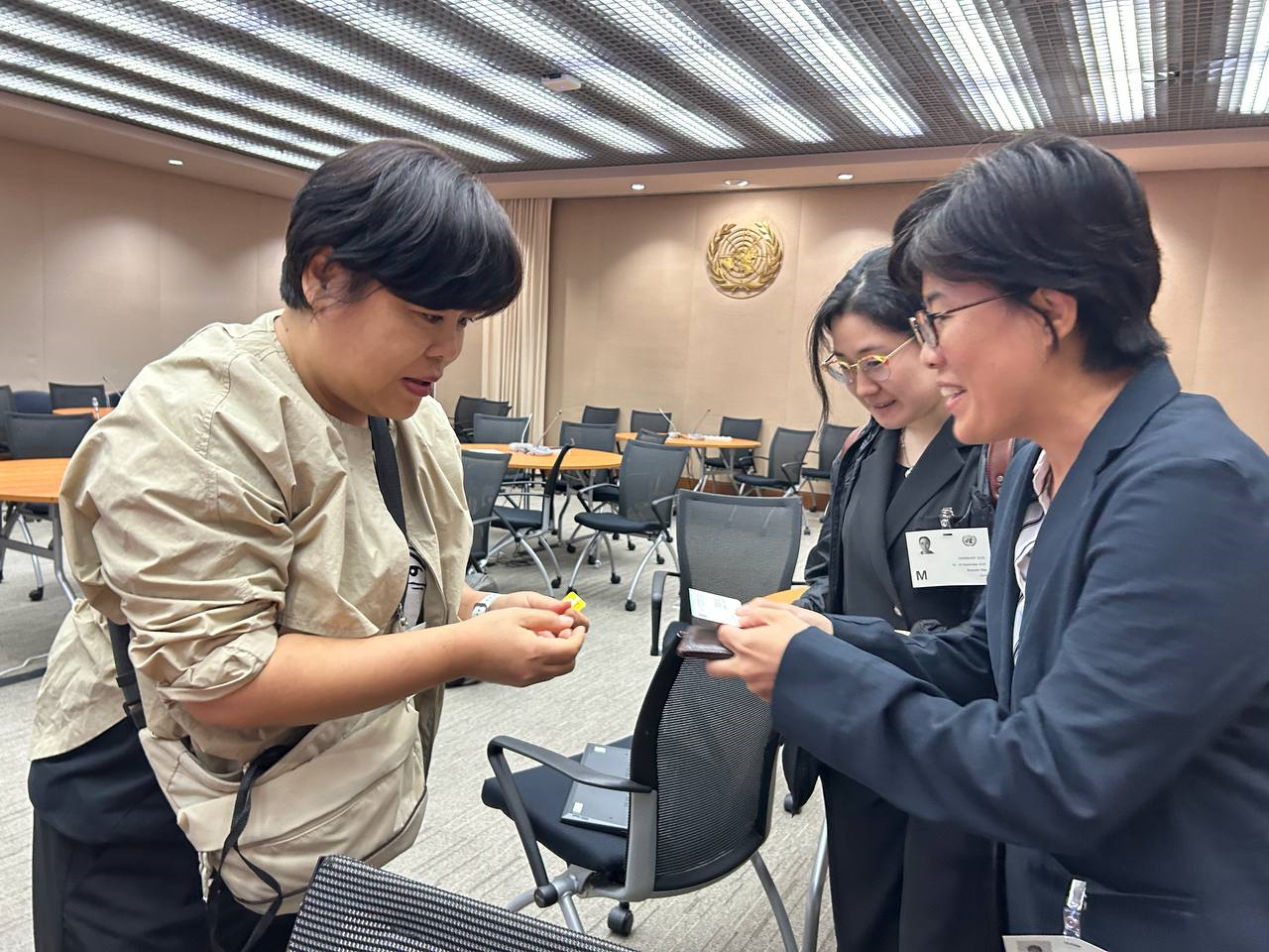 9/18-19 양일간 기업과인권네트워크, 반올림은 부스를 운영했습니다. 미리 준비한 현수막을 걸고, 반도체 여성노동자들의 건강권 문제를 다룬 리플렛을 나눠드리고 챙겨간 부채와 약과를 나눠드렸습니다. 오프닝 무대를 보고, 다른 곳에서 발표 등을 접한 참석자들이 부스를 찾아와 이것저것 물었습니다. <무색무취> 상영회 안내와 영화 상영을 위한 연락처, 자료 공유를 위해 연락처를 주고 받기도 했습니다. 관심이 컸습니다. 재미있었던 점은 한국의 투쟁 현장을 담은 부채를 나눠드리며 설명을 드리고, “단결, 투쟁” 단어를 가르쳐 드렸습니다. 집회와는 거리감이 있을 수 있는 참석자들이 한국과 반올림 활동 대한 관심으로 한국 집회에서 쓰이는 “투쟁!”을 신나게 외쳤습니다. UN 복도에서 외치는 장면이 영상, 사진으로 곳곳에 남았고, 굿즈로 각국으로 흩어졌습니다.