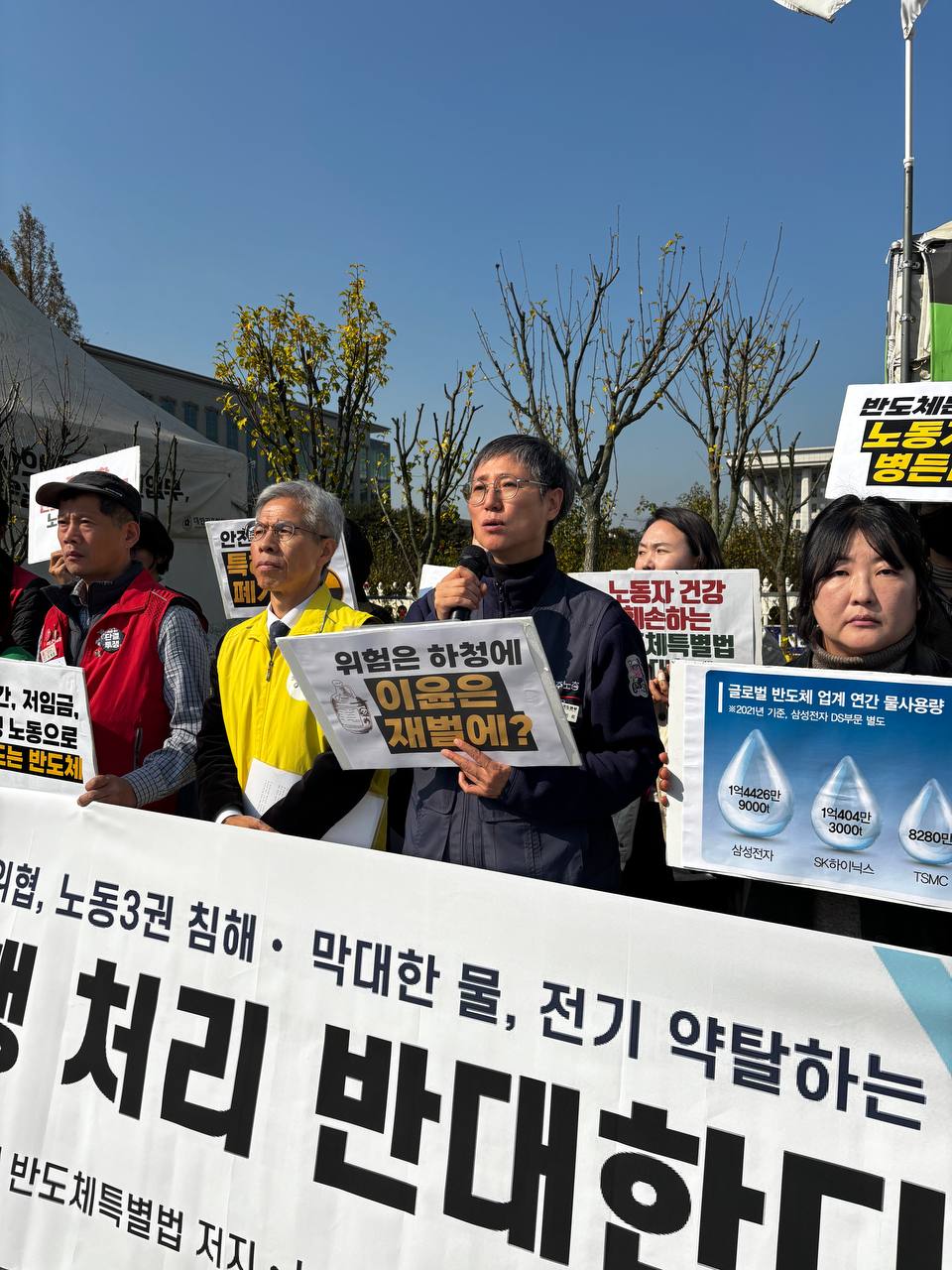 한국이 세계 반도체 시장에서의 위상이 높아졌다면, 그만큼 기후정의에 부합하는 방식으로 산업을 통제할 책임 또한 커져야 합니다. 물과 전기처럼 우리 모두가 보장받아야 할 권리와 지속가능한 삶을 실현할 사회를 고민해야 합니다. 그런데 왜 정치는 그 책임에 역행하는 것인지, 저희는 분노할 수밖에 없습니다.