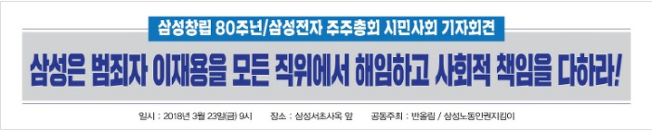 [삼성창립 80주년/삼성전자 주주총회 시민사회 기자회견] “삼성은 범죄자 이재용을 모든 직위에서 해임하고 사회적 책임을 다하라!” - 일시/장소 : 2018년 3월 23일(금) 9시, 삼성서초사옥 앞 - 주 최 : 반올림 / 삼성노동인권지킴이 <기자회견 순서> 사회 : 삼성노동인권지킴이 조대환 사무국장 1) 삼성노동인권지킴이 지도자문위원 이병천 교수 2) 언론개혁시민연대 권순택 활동가 3) 민주노총 윤택근 부위원장 4) 故 황유미님의 아버지 황상기님 5) 전 퇴진행동재벌특위 위원장, 김태연 변혁당 대표 6) 기자회견문