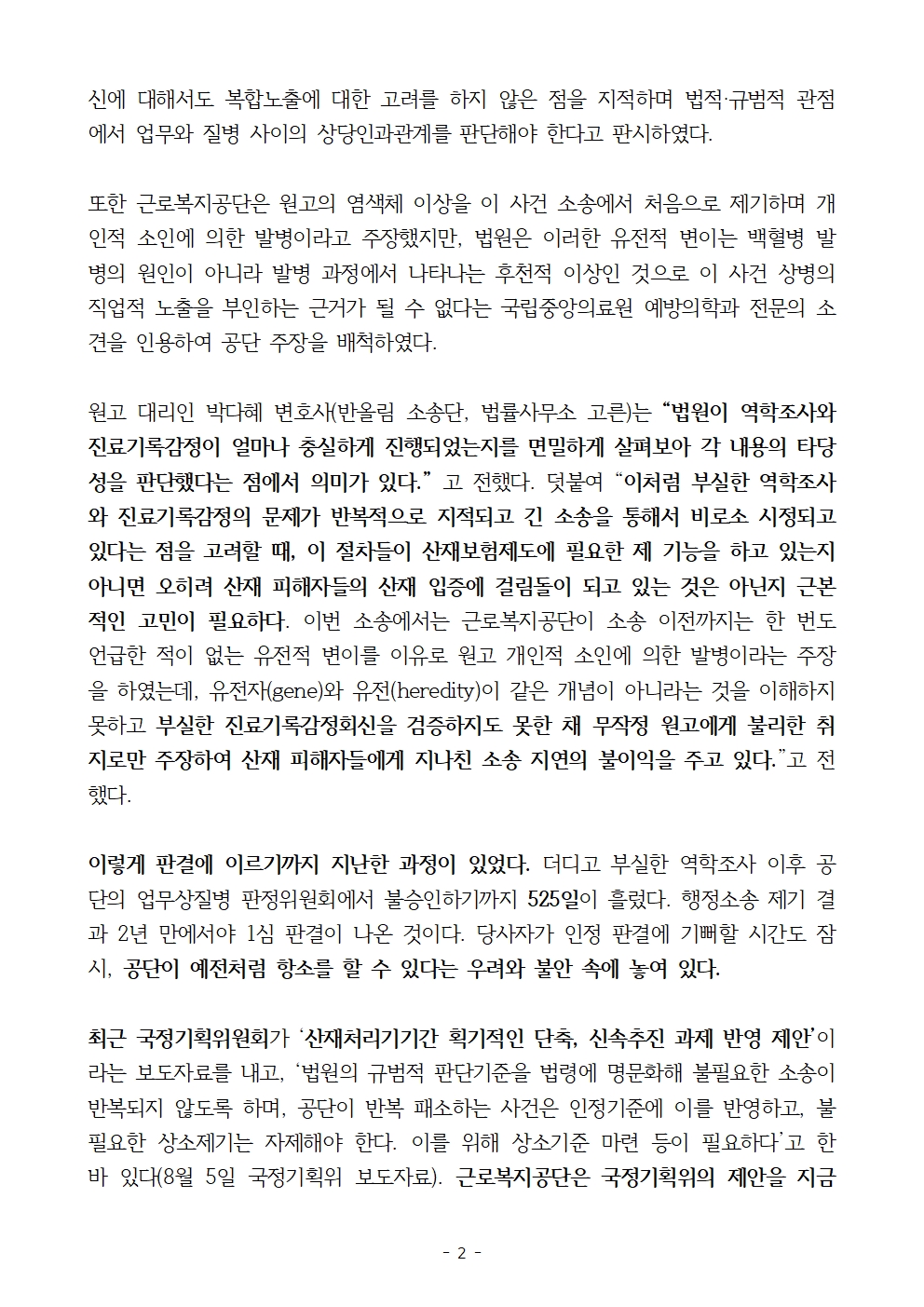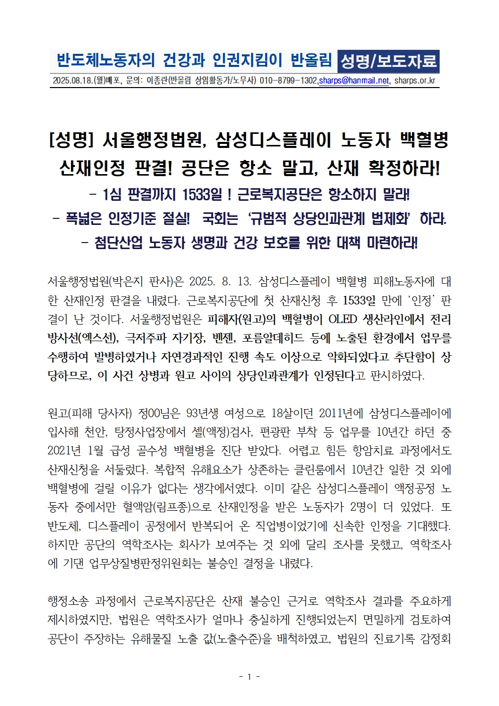 [성명] 서울행정법원, 삼성디스플레이 노동자 백혈병 산재인정 판결! 공단은 항소 말고, 산재 확정하라!.hwp