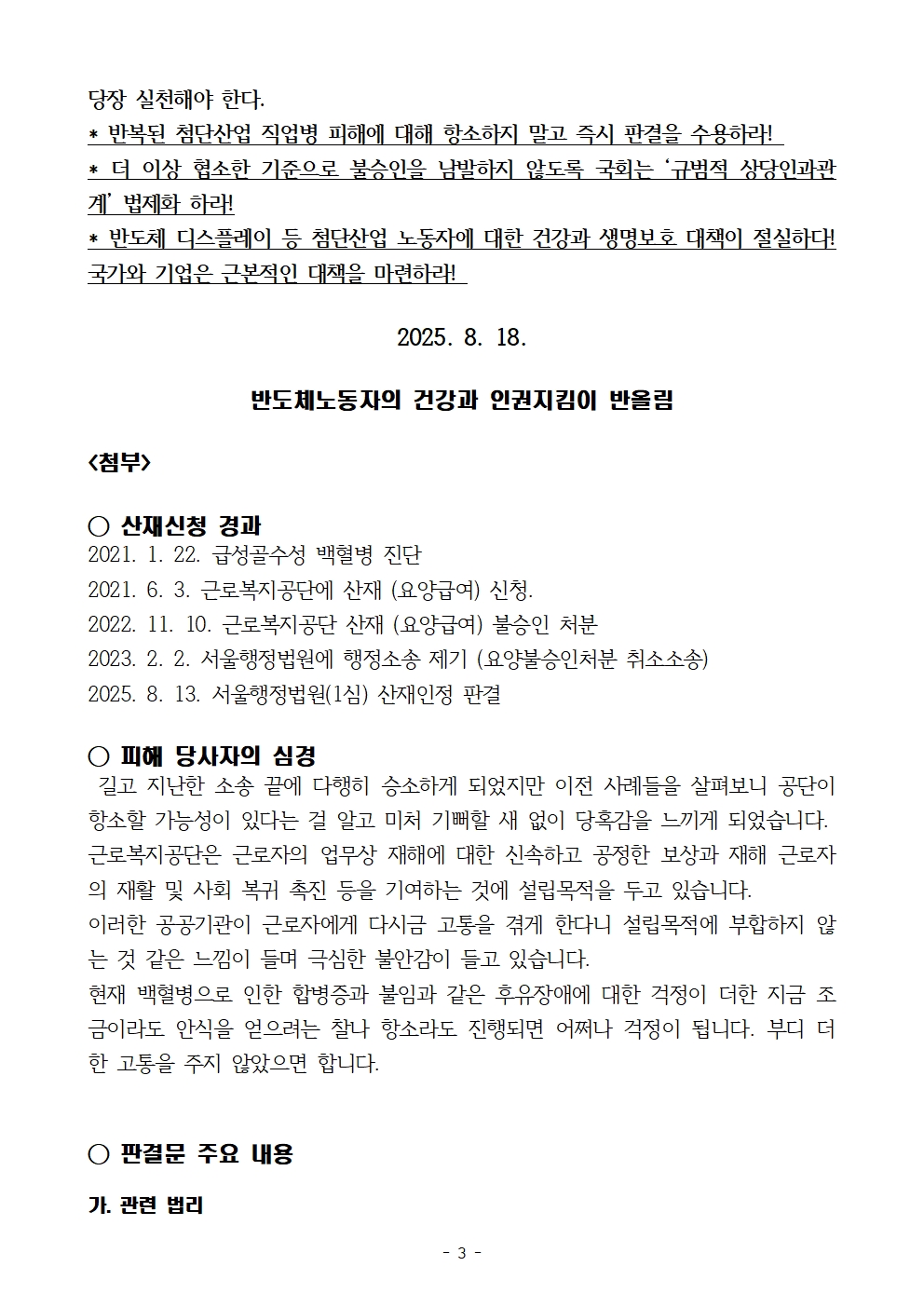 2025. 8. 13. 선고. 정00 삼성디스플레이 백혈병 산재인정 1심 판결문 (사건번호: 2023구단52485)